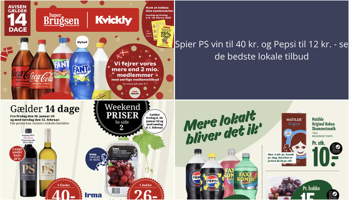 Hos Min Købmand kan du få en flaske Pepsi, Faxe Kondi eller Mirinda på 1,5 liter for kun 12 kr. pr. flaske. Tilbuddet gælder fra fredag den 6. februar til og med torsdag den 12. februar 2026.